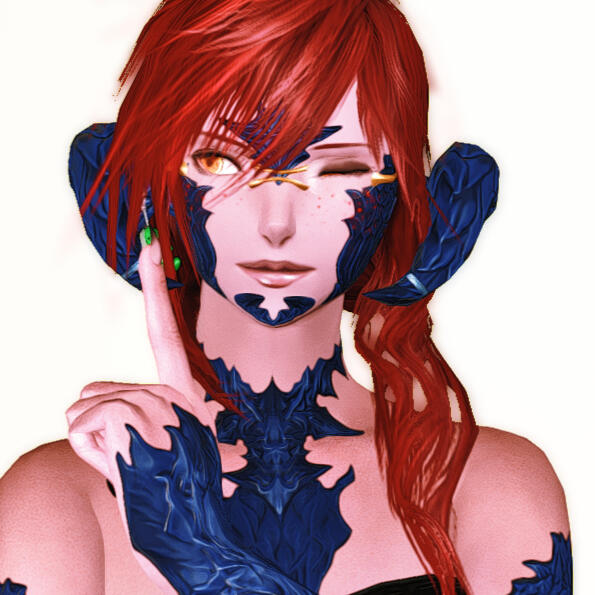 Upon laying eyes on her, one likely wouldn't think too much of Shino at first. Despite being above average height for a female Xaela, her stature is very lean compared to her brethren; a swimmer's build composed of lean muscle rather than the bulk suited for battle across The Steppe. A blank, disinterested expression adorns her sanguine features; freckled cheeks accented with characteristic onyx scales and golden eyes that bore into whatever holds her attention. Wine colored bangs add another frame to her still youthful face, though choppy locks brush past the curled, onyx horns that adorn either side of her head. The rest of her hair is gracefully tossed over the opposite shoulder, somewhat delicate merlot waves draped against her scaled neck.Said scales continue under ornate clothing, plating that stretches over lithe shoulders and down her spine, branching out to curl about her hips. However, scarring across her left hip looks to cut the normally symmetrical plating in two, an unusual mark given her combat avoidant professions. A strong, barbed tail curls around her person while she stands still, though it elects to stretch back out behind her when she takes her first few steps.In spite of apparent disinterest, the Xaela is quite the conversationalist, always ready and willing to hear of the wayward stranger's tale of their own adventures.
